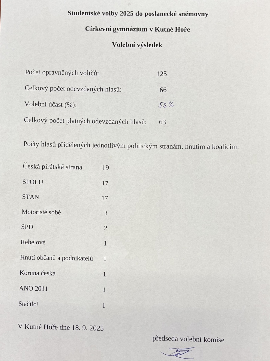 Pravidelně naši studenti využívají možnosti vyzkoušet si volby – prezidentské i parlamentní - a seznámit se tak s principy zastupitelské demokracie a volebním systémem České republiky. Volit mohli studenti starší 15 let, ve škole jsme měli 125 opravněných voličů. K urně přišlo 66 studentů, tedy 53 %. A jak to dopadlo? První Piráti (19 hlasů), druzí SPOLU (17 hlasů) a STAN (17 hlasů). Kompletní výsledky najdete v galerii.