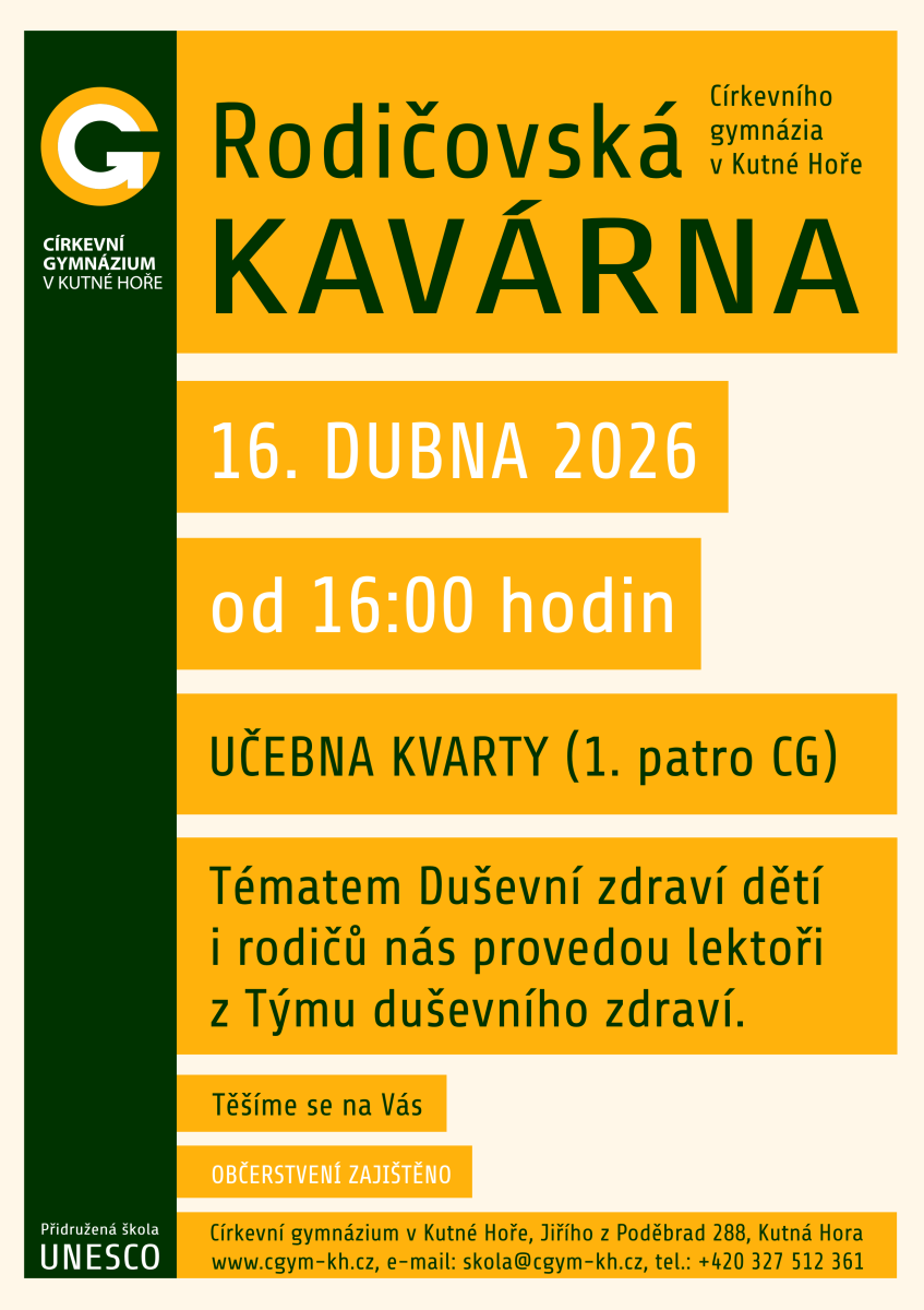 Vážení rodiče, dovolujeme si Vás pozvat ve čtvrtek 16. dubna 2026 od 16:00 do učebny kvarty v 1. patře církevního gymnázia na Rodičovskou kavárnu. Tématem Duševní zdraví dětí i rodičů nás provedou lektoři z Týmu duševního zdraví.